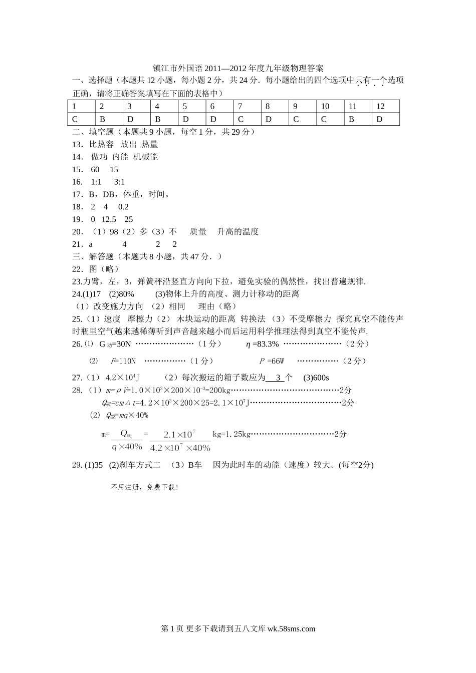 镇江市外国语2011—2012年度九年级物理答案一、选择题(本题共12小题,每小题2分,共24分.每小题给出的四个选项中只有一个选项正确,请将正确答案填写在下面的表格中)123456789101112CBDBDDCDCCBD二、填空题(...