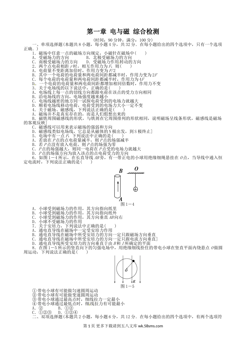 高二物理第一章 电与磁单元测试题及答案解析.doc_第1页