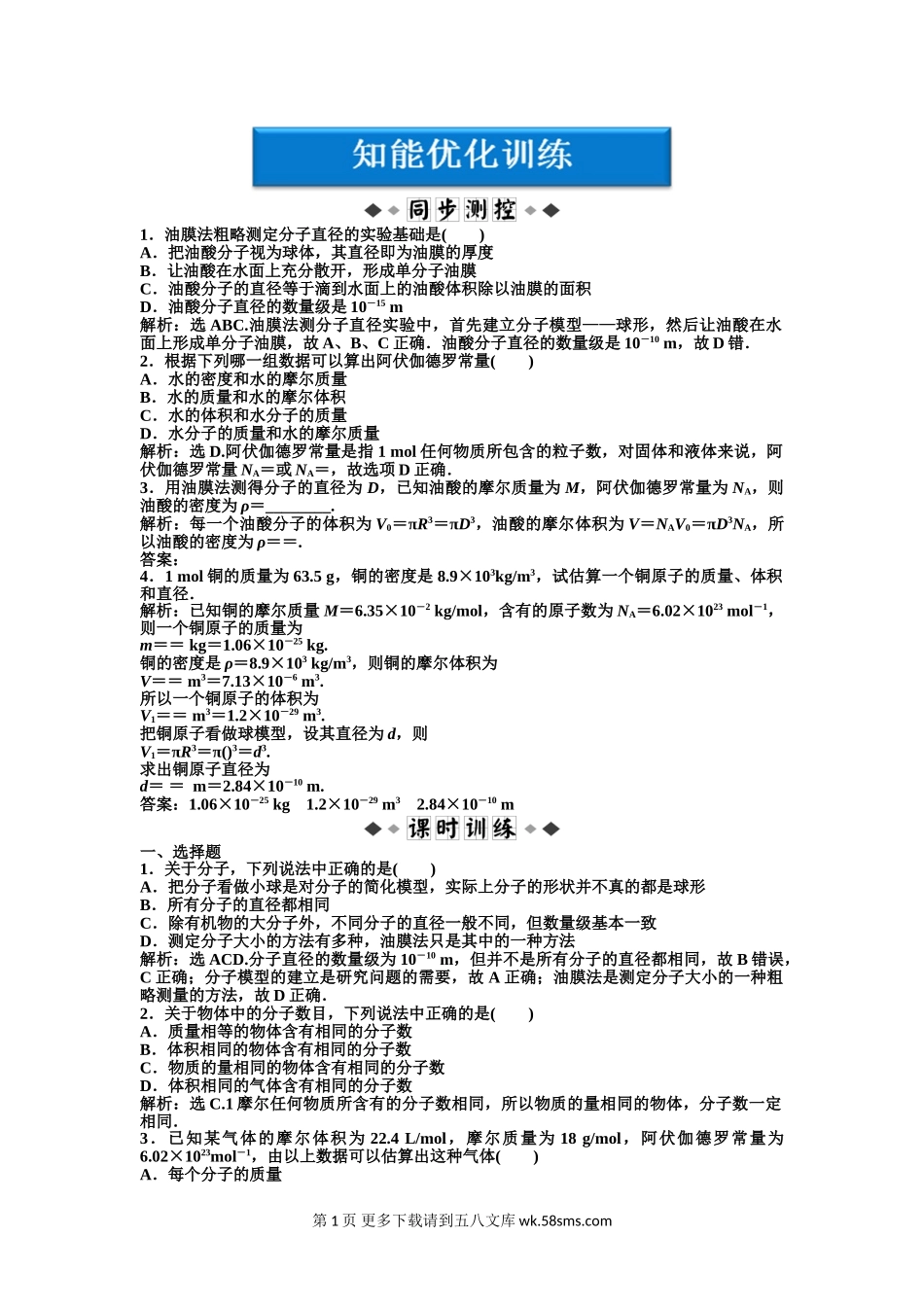 1.油膜法粗略测定分子直径的实验基础是()A.把油酸分子视为球体,其直径即为油膜的厚度B.让油酸在水面上充分散开,形成单分子油膜C.油酸分子的直径等于滴到水面上的油酸体积除以油膜的面积D.油酸分子直径的数...