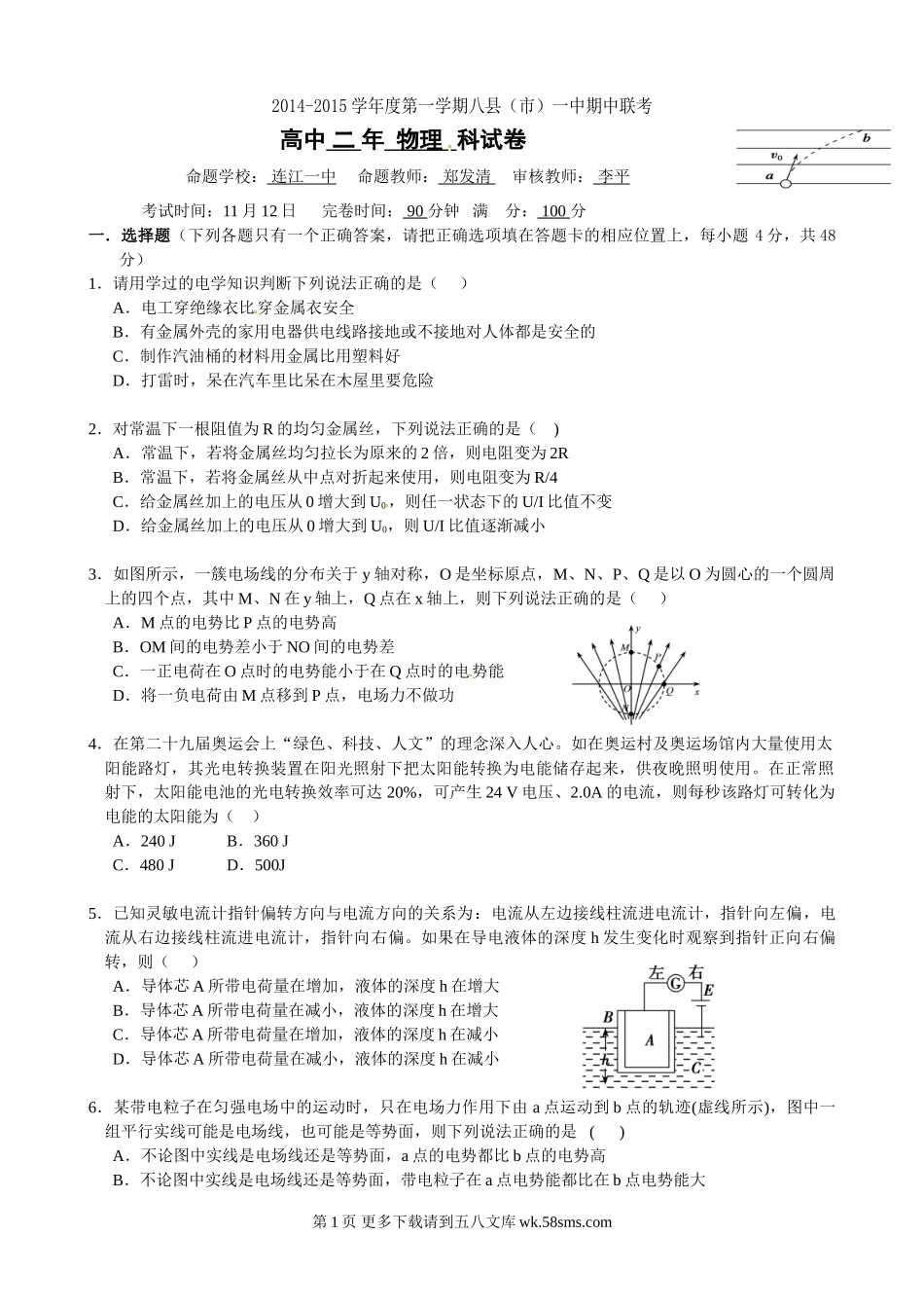 2014-2015学年度第一学期八县(市)一中期中联考高中二年物理科试卷命题学校:连江一中命题教师:郑发清审核教师:李平考试时间:11月12日完卷时间:90分钟满分:100分一.选择题(下列各题只有一个正确答案,请...