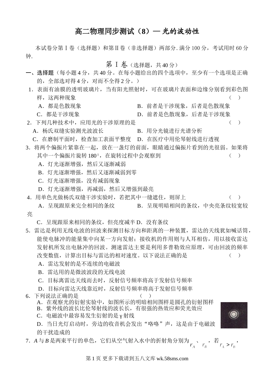 高二物理高二物理光的波动性测试题及答案.doc_第1页