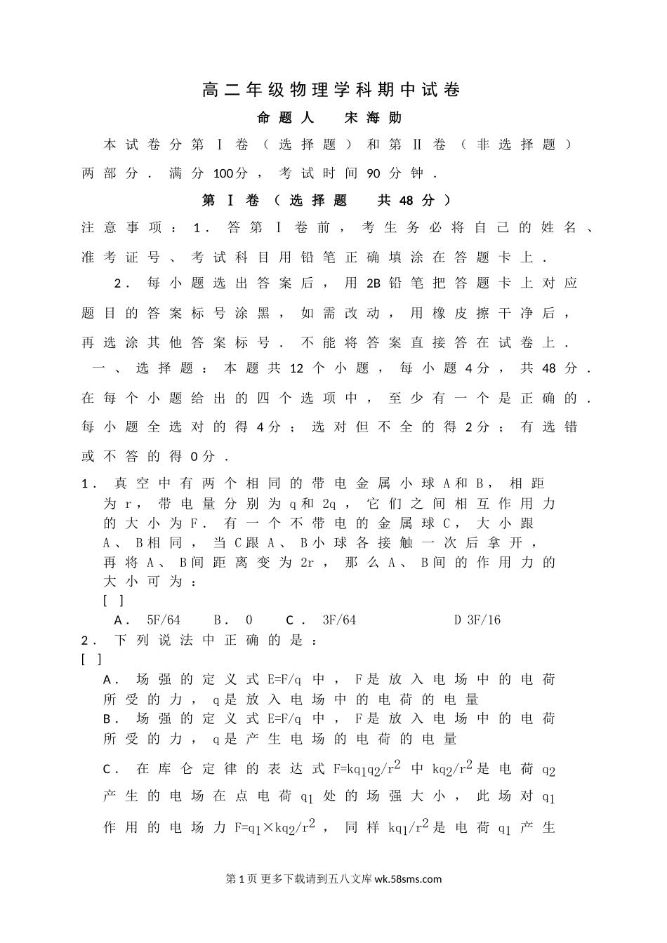 高二年级物理学科期中试卷命题人宋海勋本试卷分第Ⅰ卷(选择题)和第Ⅱ卷(非选择题)两部分.满分100分,考试时间90分钟.第Ⅰ卷(选择题共48分)注意事项:1.答第Ⅰ卷前,考生务必将自己的姓名、准考证号、考...