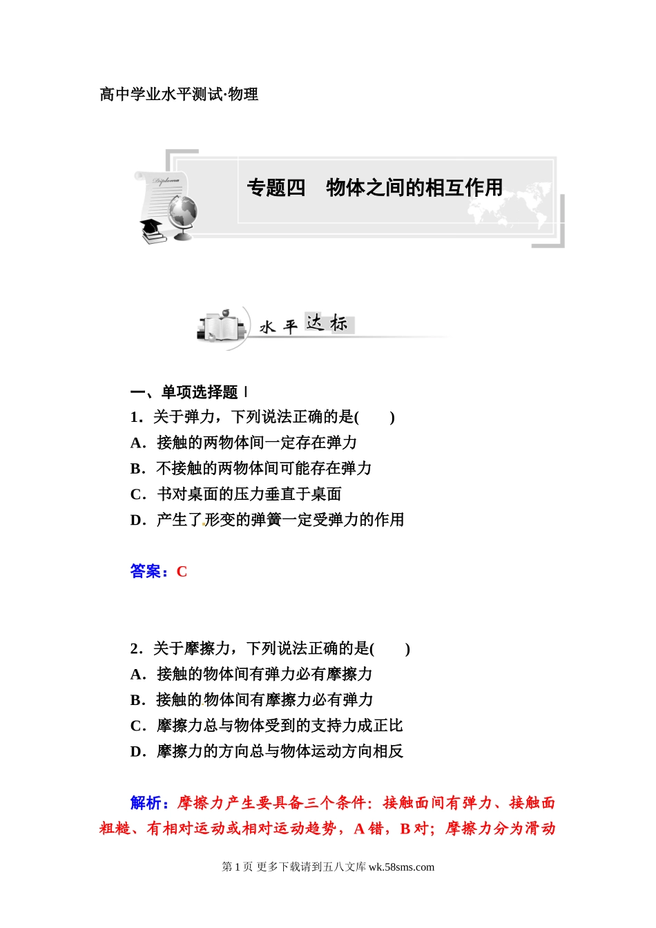 高中学业水平测试·物理一、单项选择题Ⅰ1.关于弹力,下列说法正确的是()A.接触的两物体间一定存在弹力B.不接触的两物体间可能存在弹力C.书对桌面的压力垂直于桌面D.产生了形变的弹簧一定受弹力的作用[来源:...