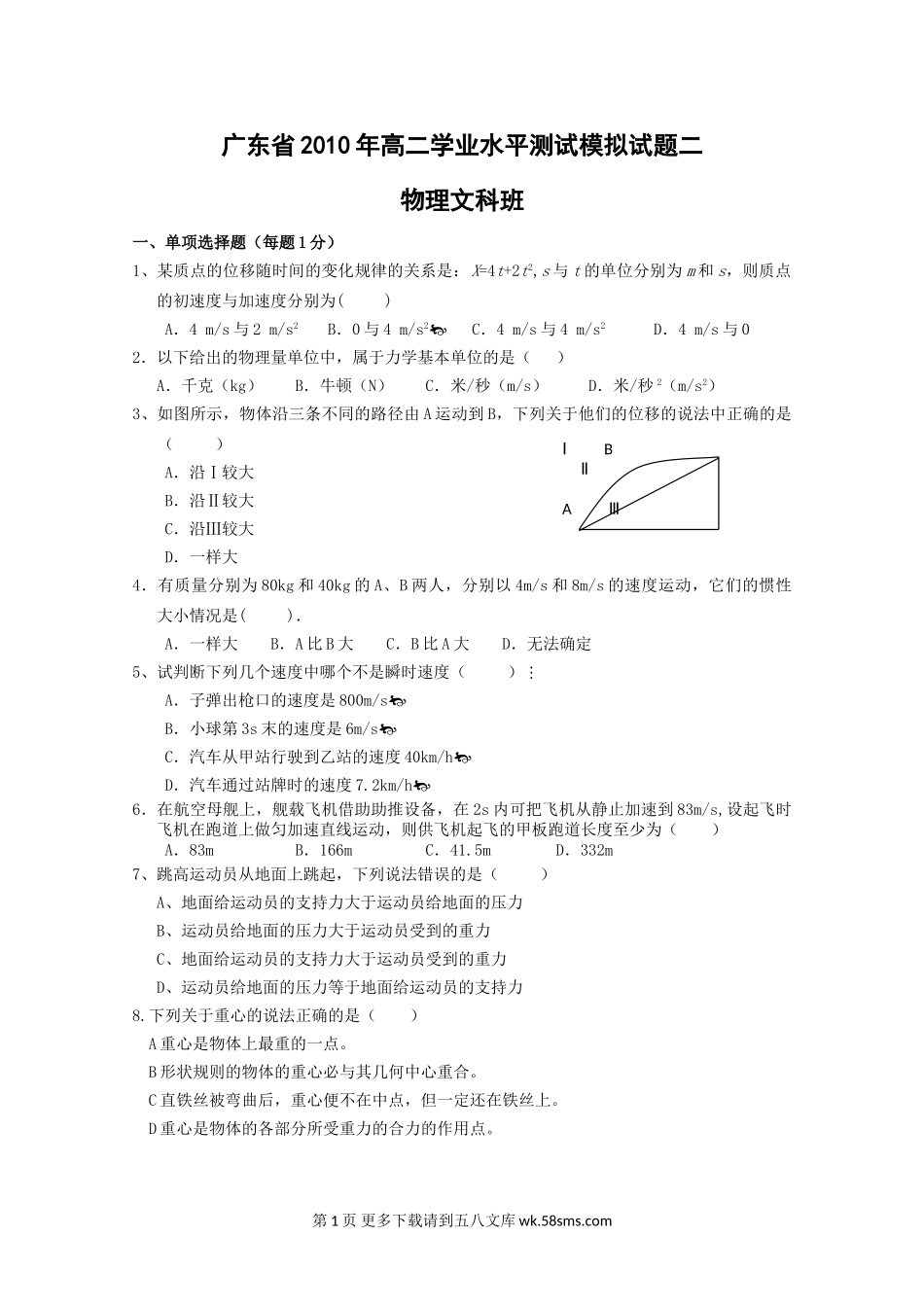 高二物理广东省高二物理学业水平测试模拟题二(文科班).doc_第1页