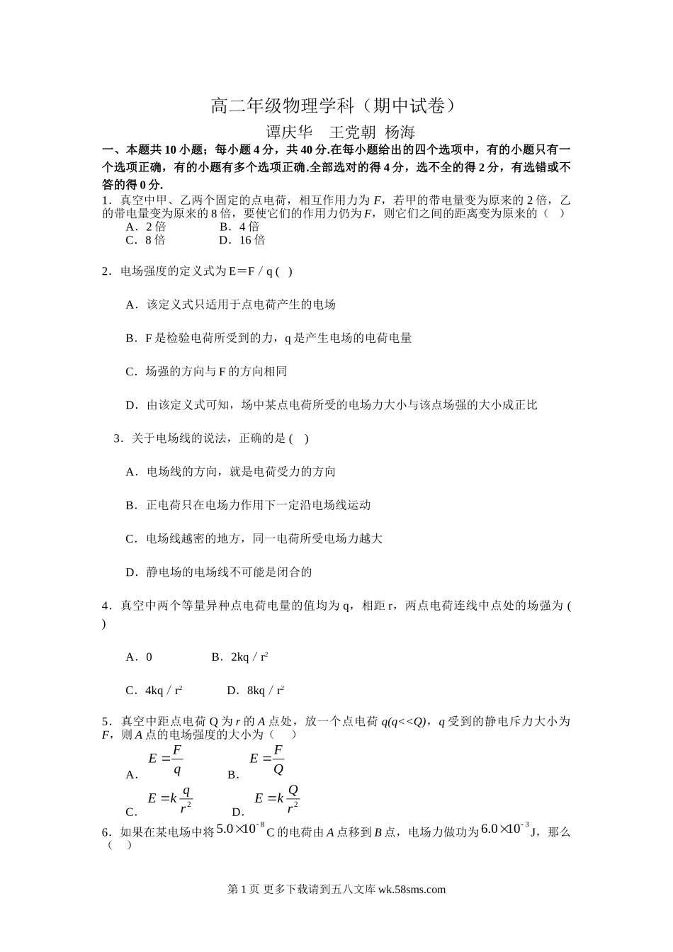 高二年级物理学科(期中试卷)谭庆华王党朝杨海一、本题共10小题;每小题4分,共40分.在每小题给出的四个选项中,有的小题只有一个选项正确,有的小题有多个选项正确.全部选对的得4分,选不全的得2分,有选错或不...