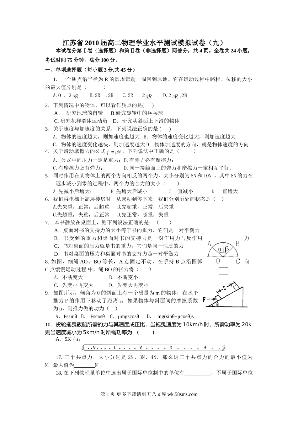 江苏省2010届高二物理学业水平测试模拟试卷(九)本试卷分第Ⅰ卷(选择题)和第Ⅱ卷(非选择题)两部分,共4页。全卷共24小题,考试时间75分钟,满分100分。一、单项选择题(每小题3分,共45分)1.一个质点沿半径...