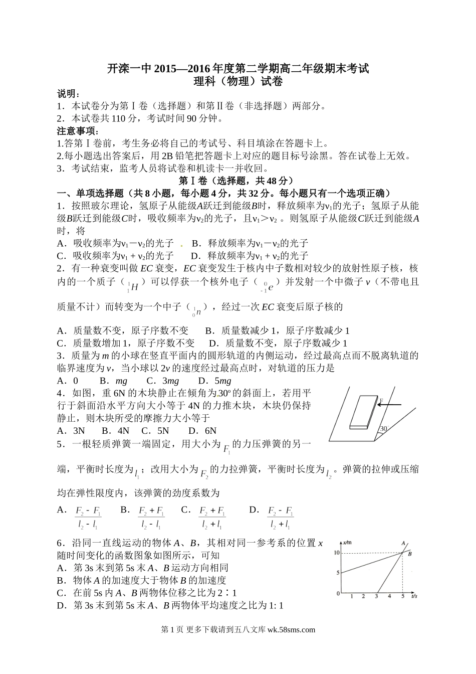 开滦一中2015—2016年度第二学期高二年级期末考试理科(物理)试卷说明:1.本试卷分为第Ⅰ卷(选择题)和第Ⅱ卷(非选择题)两部分。2.本试卷共110分,考试时间90分钟。注意事项:1.答第Ⅰ卷前,考生务必将自己...