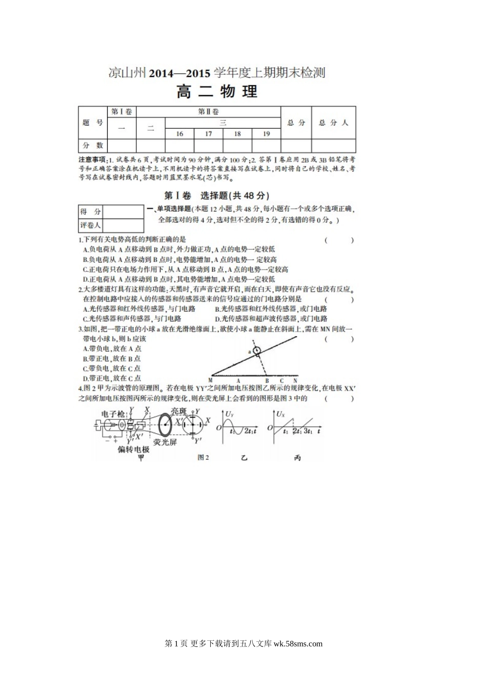 高二物理凉山州高二上物理期末试题及答案.doc_第1页
