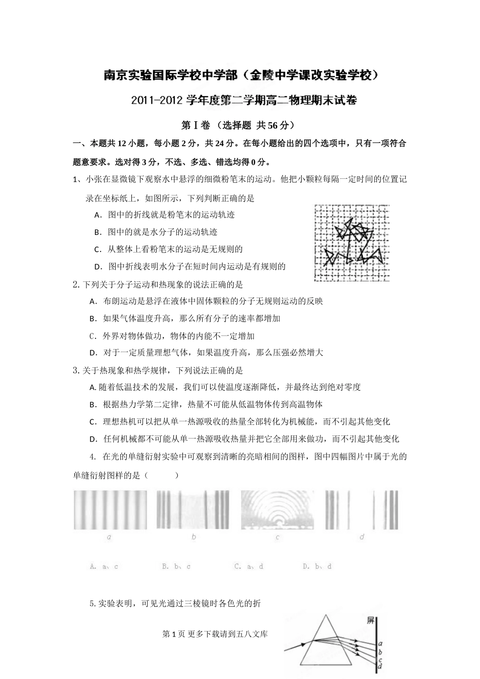第Ⅰ卷(选择题共56分)一、本题共12小题,每小题2分,共24分。在每小题给出的四个选项中,只有一项符合题意要求。选对得3分,不选、多选、错选均得0分。1、小张在显微镜下观察水中悬浮的细微粉笔末的运动。他把...