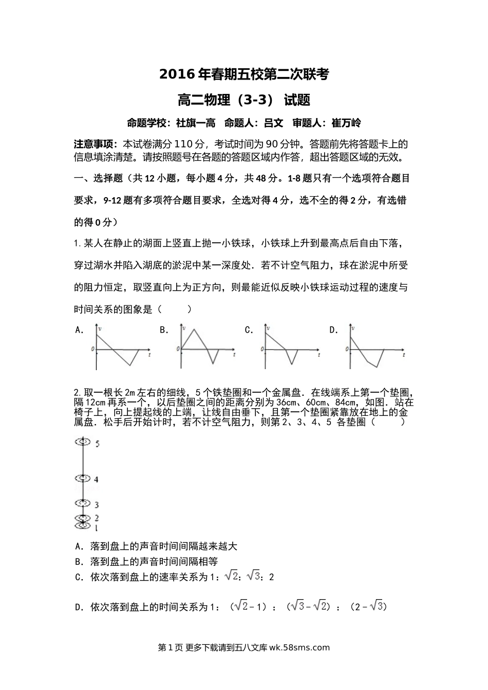 2016年春期五校第二次联考高二物理(3-3)试题命题学校:社旗一高命题人:吕文审题人:崔万岭注意事项:本试卷满分110分,考试时间为90分钟。答题前先将答题卡上的信息填涂清楚。请按照题号在各题的答题区域内作...