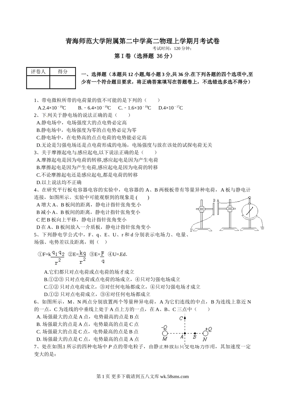 高二物理青海师大附属第二中学高二上学期第一次月考物理试卷.doc_第1页