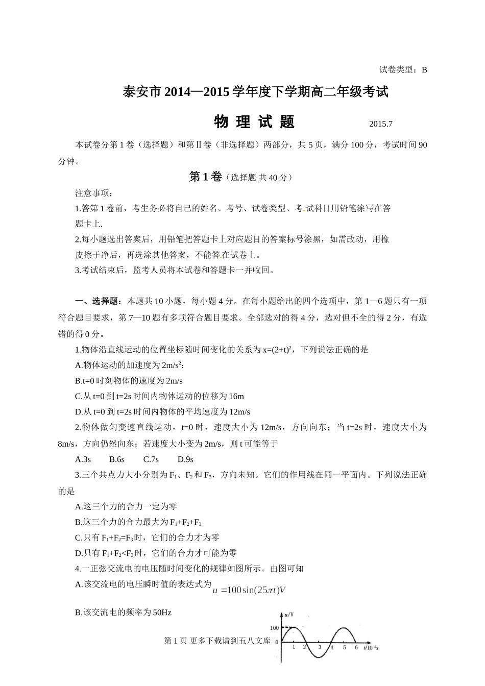 试卷类型:B泰安市2014—2015学年度下学期高二年级考试物理试题2015.7[来源:学,科,网]本试卷分第1卷(选择题)和第Ⅱ卷(非选择题)两部分,共5页,满分100分,考试时间90分钟。第1卷(选择题共40分)注意事项:1...