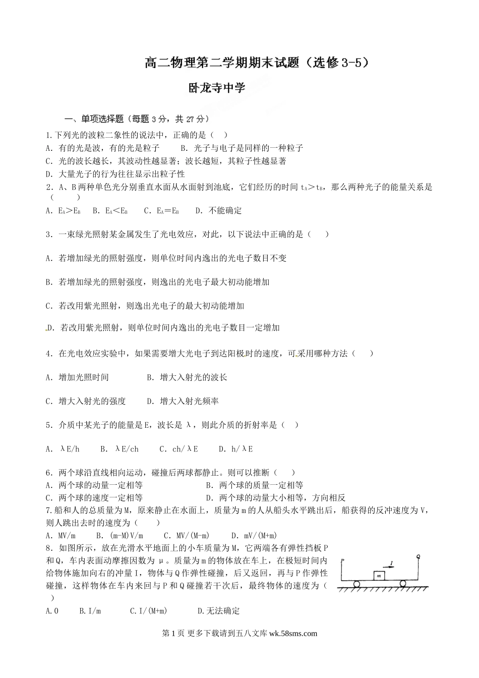 高二物理卧龙寺中学高二上期末物理试题及答案.doc_第1页