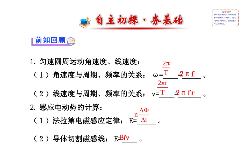 第五章交变电流1交变电流1.匀速圆周运动角速度、线速度:(1)角速度与周期、频率的关系:ω=____=_____。(2)线速度与周期、频率的关系:v=____=______。2.感应电动势的计算:(1)法拉第电磁感应定律:E=_____...