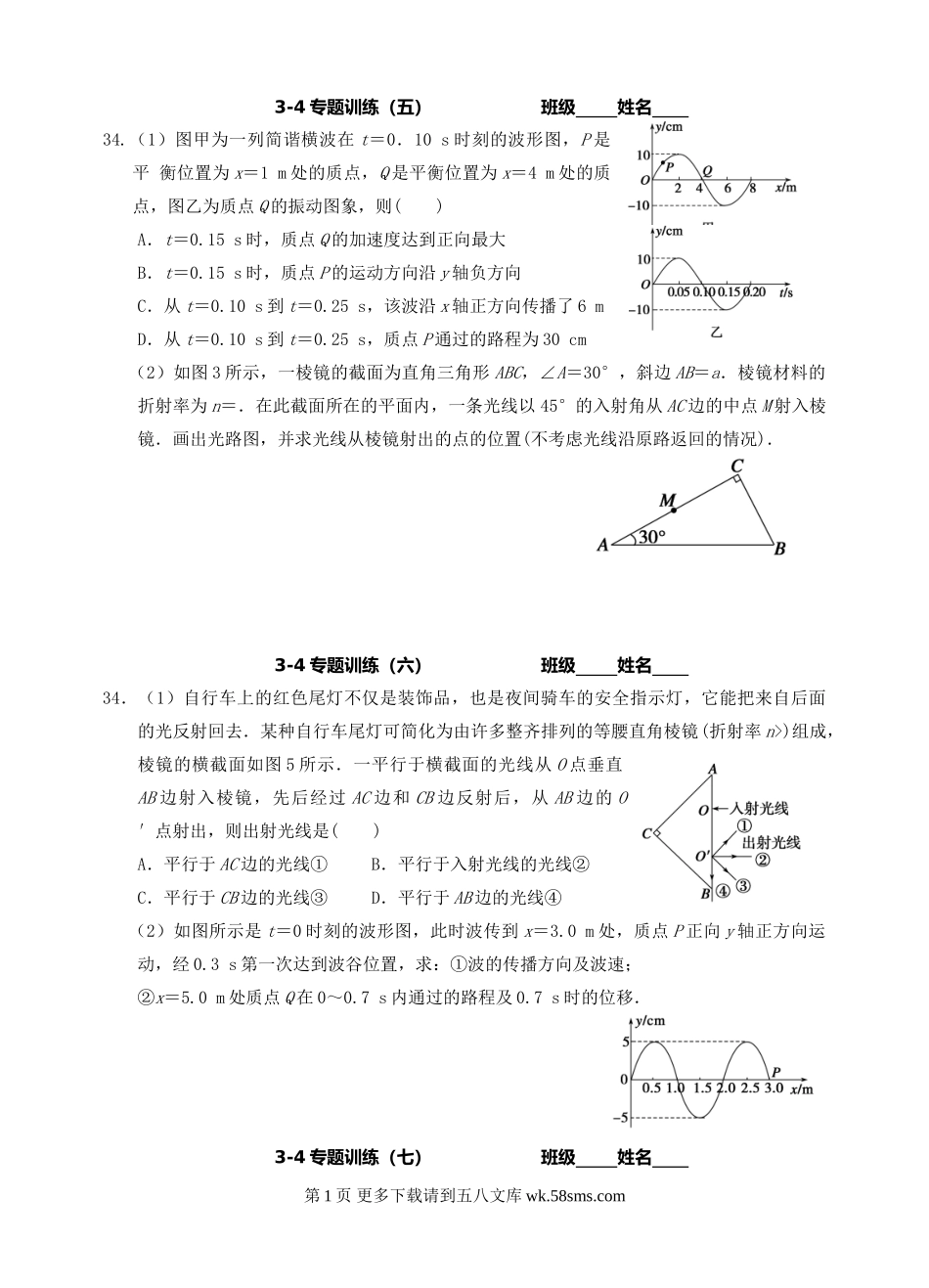 3-4专题训练(五)班级姓名34.(1)图甲为一列简谐横波在t=0.10s时刻的波形图,P是平衡位置为x=1m处的质点,Q是平衡位置为x=4m处的质点,图乙为质点Q的振动图象,则()A.t=0.15s时,质点Q的加速度达到正向最...