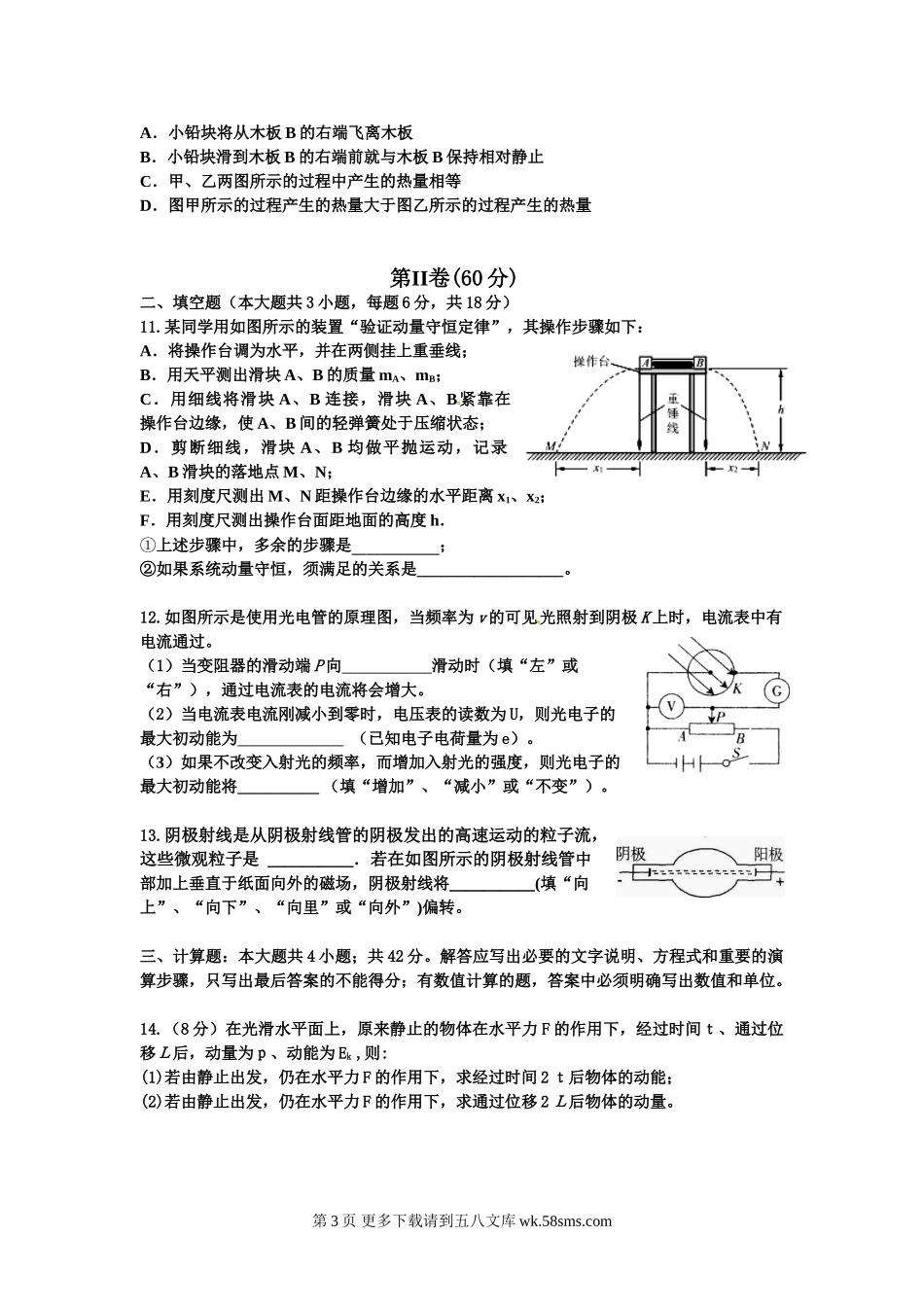 一、选择题(10个小题,共50分,1-7小题给出的四个选项中,只有一个选项正确;8-10小题有多个选项正确,全选对的得5分,选对但不全的得3分,有错选的得0分)1.下面关于冲量的说法中正确的是()A.物体受到很大的...