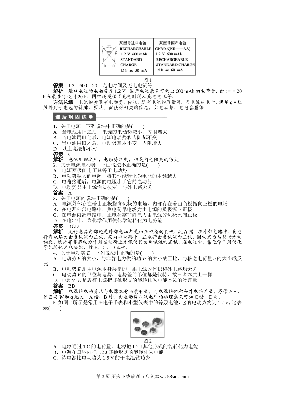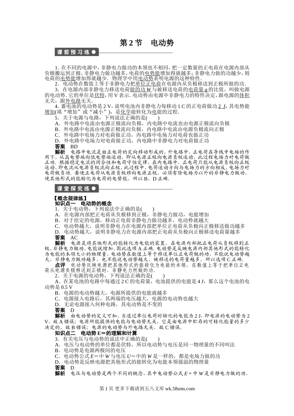 第2节电动势1.在不同的电源中,非静电力做功的本领也不相同,把一定数量的正电荷在电源内部从负极搬运到正极,非静电力做功越多,电荷的电势能增加得就越多;非静电力做的功越少,则电荷的电势能增加得就越少....