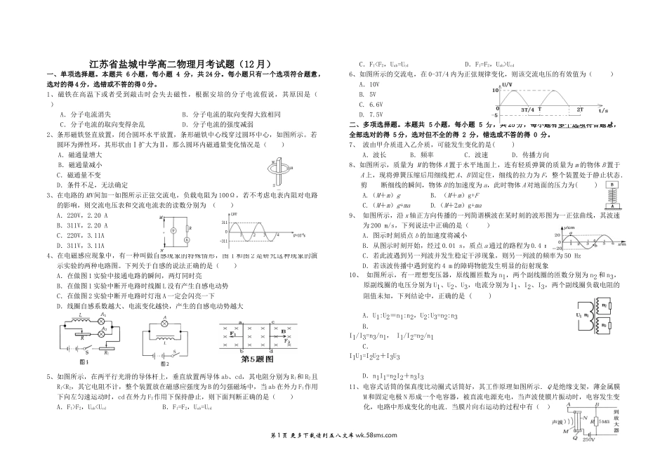 江苏省盐城中学高二物理月考试题(12月)一、单项选择题。本题共6小题,每小题4分,共24分。每小题只有一个选项符合题意,选对的得4分,选错或不答的得0分。1、磁铁在高温下或者受到敲击时会失去磁性,根据安培的...