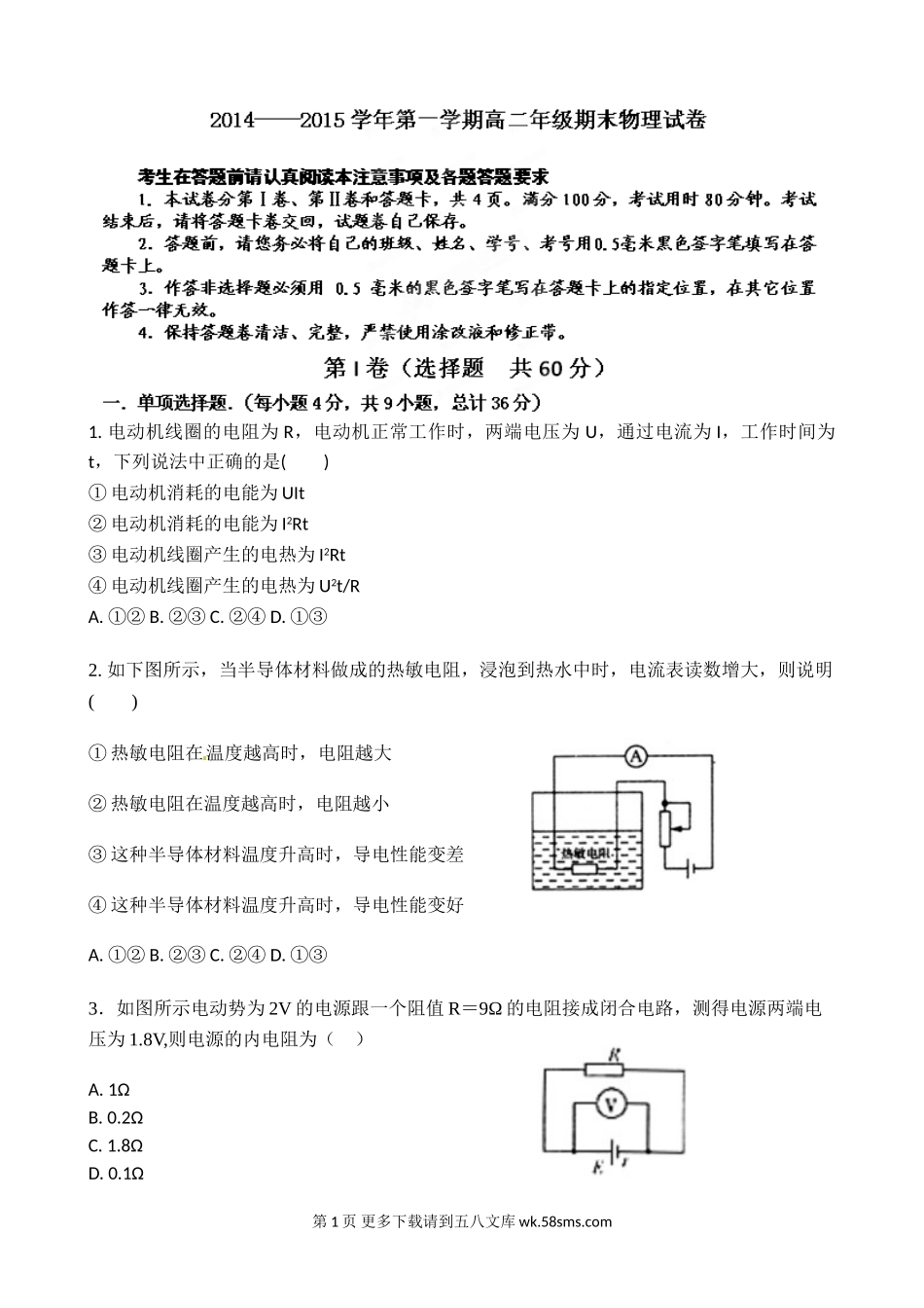 1.电动机线圈的电阻为R,电动机正常工作时,两端电压为U,通过电流为I,工作时间为t,下列说法中正确的是()①电动机消耗的电能为UIt②电动机消耗的电能为I2Rt③电动机线圈产生的电热为I2Rt④电动机线圈产生的电热...