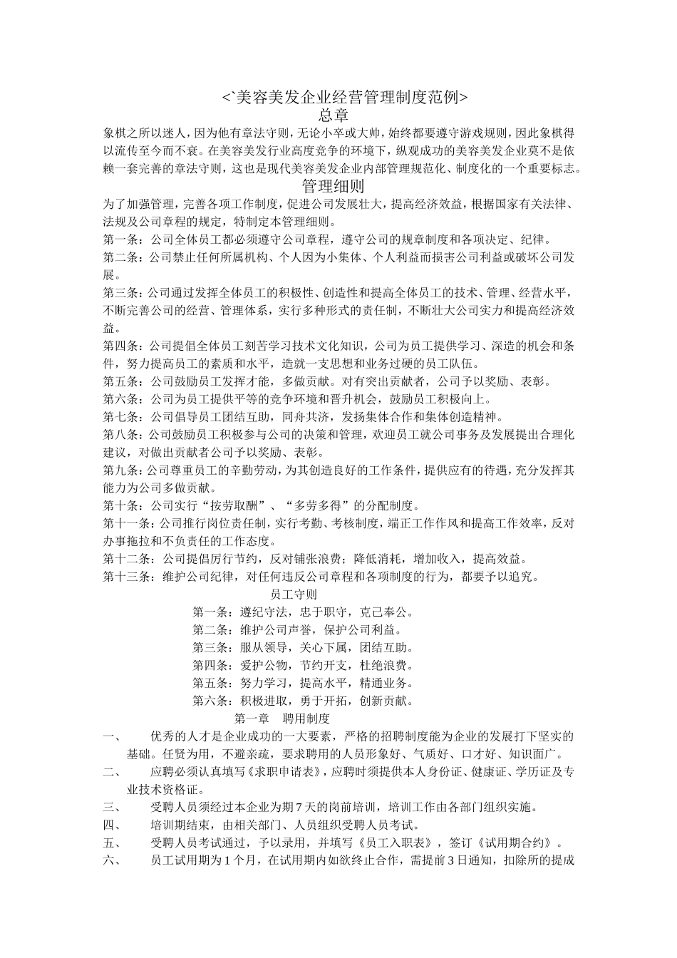 <`美容美发企业经营管理制度范例>总章象棋之所以迷人,因为他有章法守则,无论小卒或大帅,始终都要遵守游戏规则,因此象棋得以流传至今而不衰。在美容美发行业高度竞争的环境下,纵观成功的美容美发企业莫不是依...