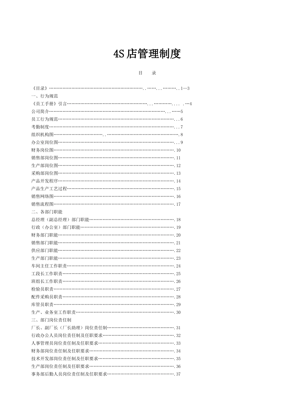 4S店管理制度目录《目录》………………………………………………………..……...………..1—3一、行为规范《员工手册》引言………………………………………………...………….....…4公司简介………………………...