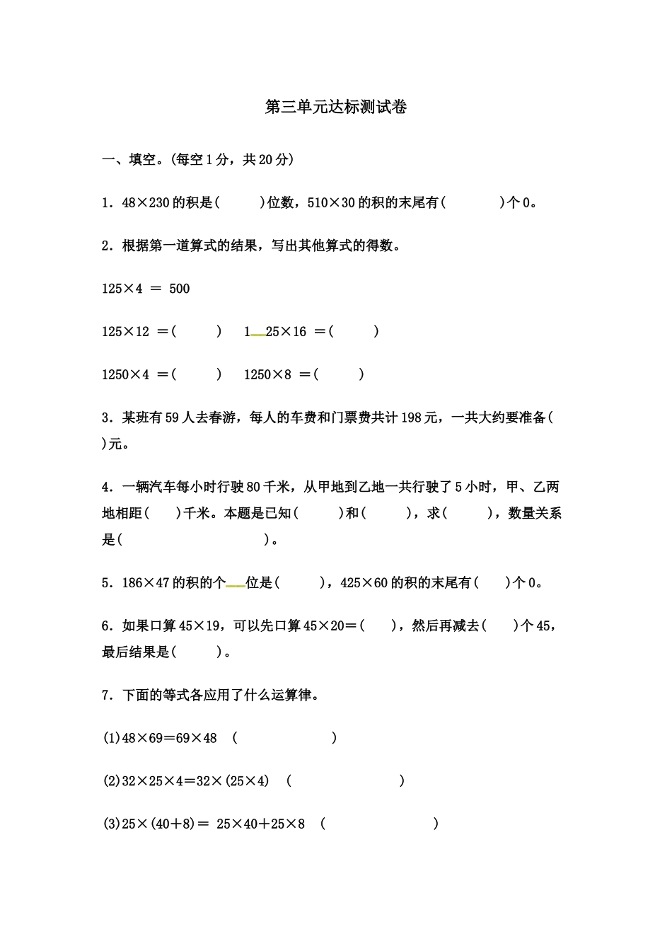 第三单元达标测试卷一、填空。(每空1分,共20分)1.48×230的积是()位数,510×30的积的末尾有()个0。2.根据第一道算式的结果,写出其他算式的得数。125×4=500125×12=()125×16=()1250×4=()1250×8=()3...