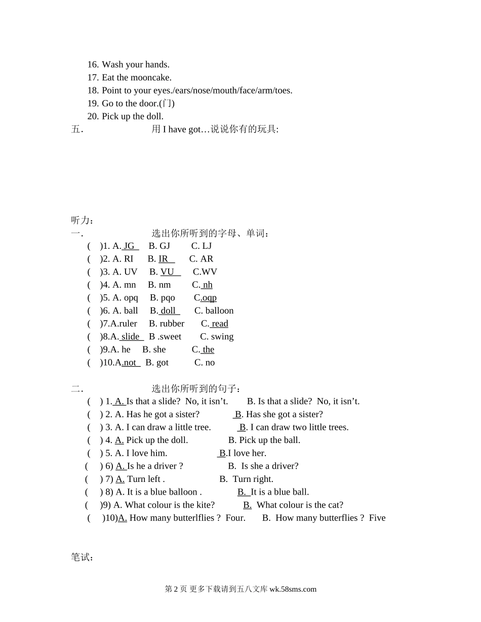 口试:一.正确朗读下列字母组:NMJGUVIRSZpqhnwvljxs二.正确朗读下列单词:jumpmouthautumnbeanballoonbicyclesisterslideswingfivepurplebrowncolourturnfiremanhowmanypickoutveryhighatallpolicemanIsheasho...
