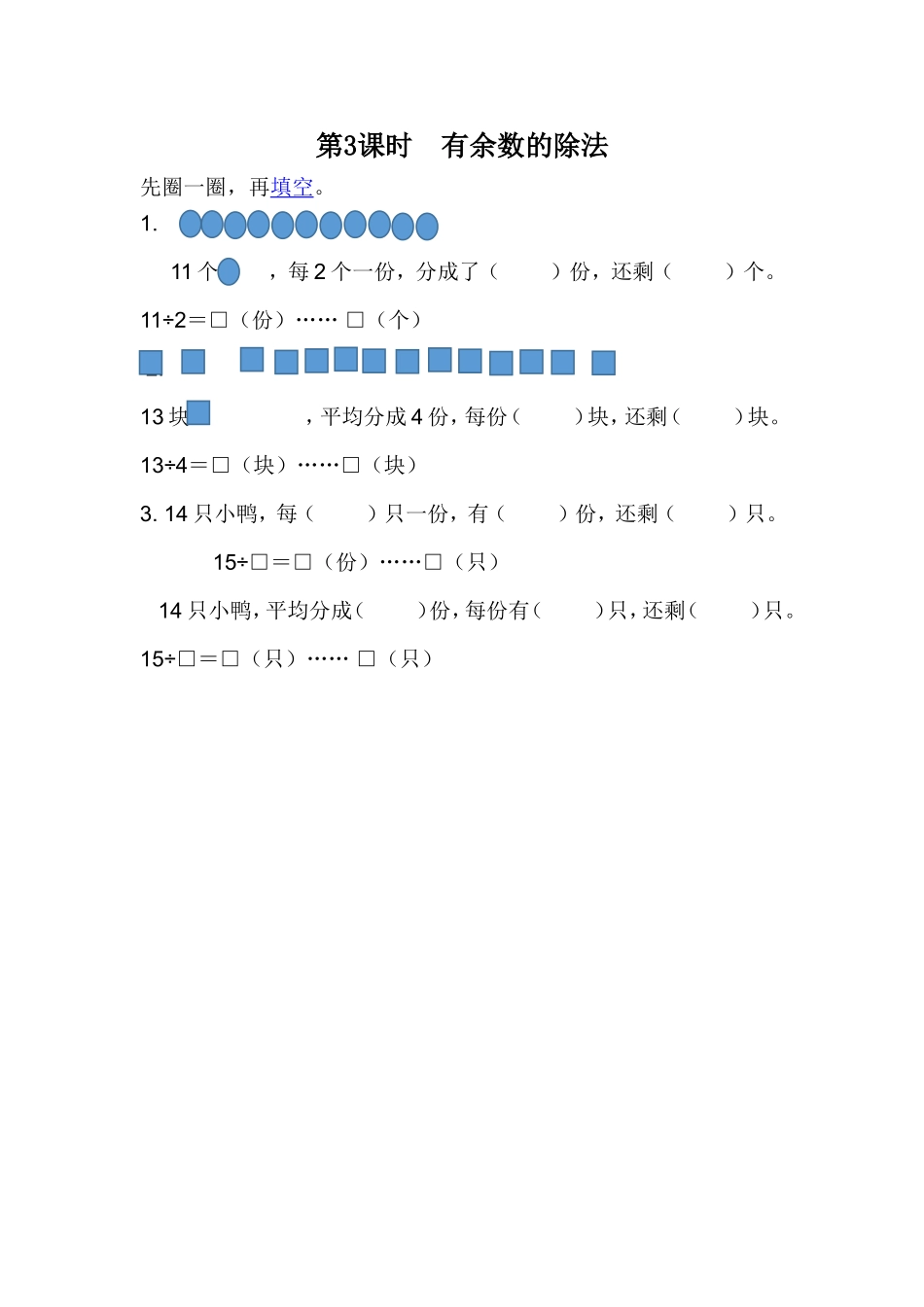 第3课时有余数的除法先圈一圈,再填空。1.11个,每2个一份,分成了()份,还剩()个。11÷2=□(份)……□(个)2.13块,平均分成4份,每份()块,还剩()块。13÷4=□(块)……□(块)3.14只小鸭,每(...
