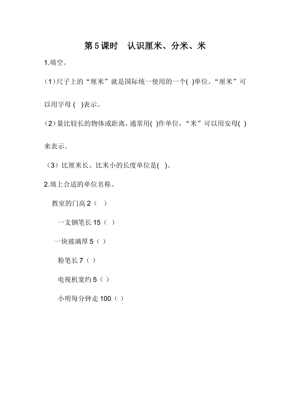 第5课时认识厘米、分米、米1.填空。(1)尺子上的“厘米”就是国际统一使用的一个()单位。“厘米”可以用字母()表示。(2)量比较长的物体或距离,通常用()作单位,“米”可以用安母()来表示。(3)比厘米长、比...