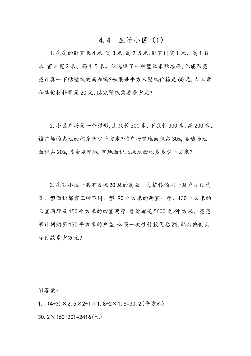 4.4生活小区(1)1.亮亮的卧室长4米,宽3米,高2.5米,卧室门宽1米、高1.8米,窗户宽2米、高1.5米。他选择了一种壁纸来贴墙面,你能帮亮亮计算一下贴壁纸的面积吗?如果每平方米壁纸价格是60元,人工费和其他材料费是20...