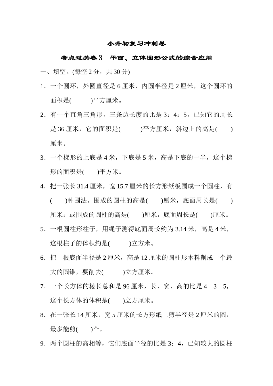 小升初复习冲刺卷考点过关卷3平面、立体图形公式的综合应用一、填空。(每空2分,共30分)1.一个圆环,外圆直径是6厘米,内圆半径是2厘米,这个圆环的面积是()平方厘米。2.有一个直角三角形,三条边长度的比是3:...