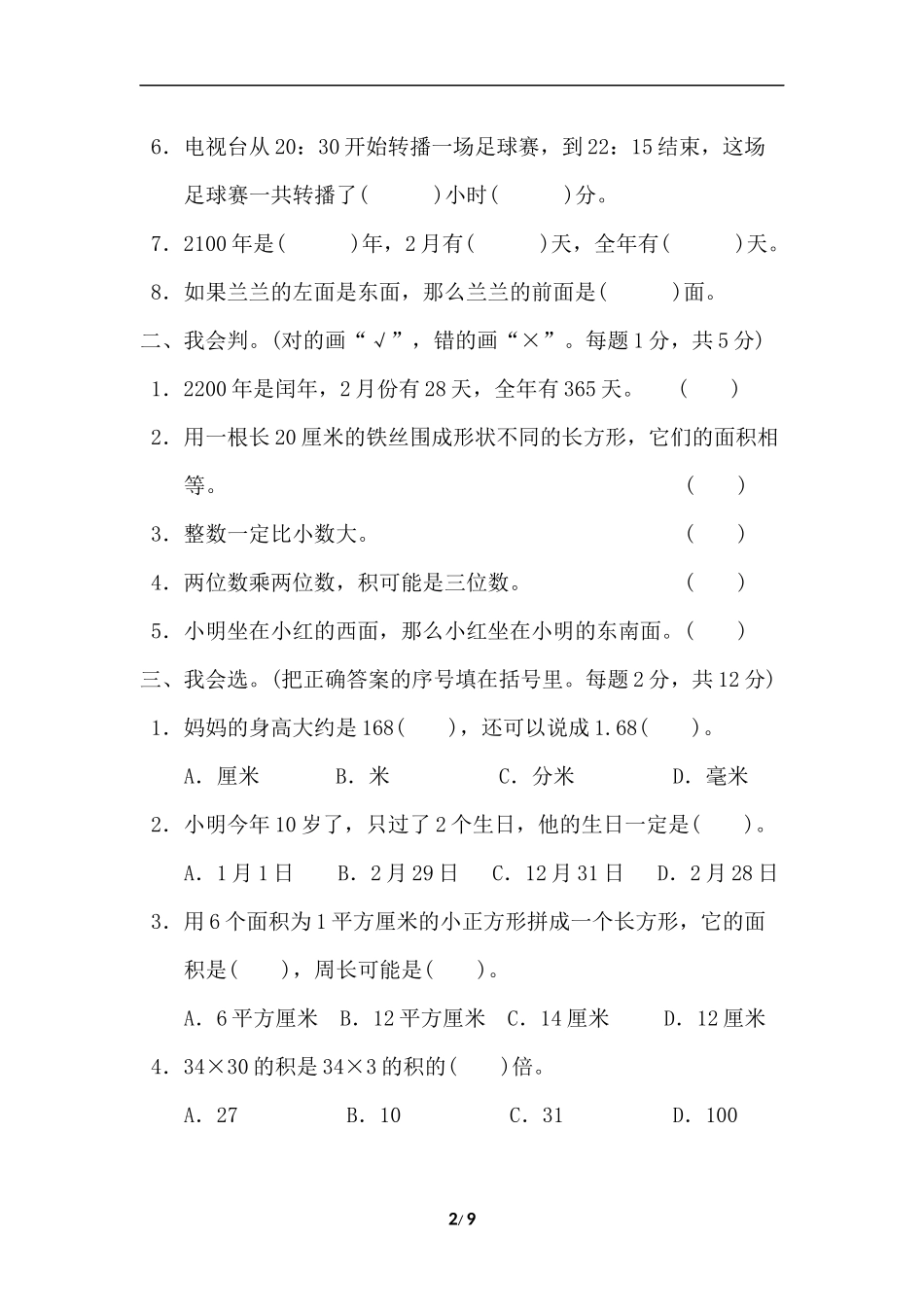 【小学三年级下册数学冀教版】期末检测卷.docx_第2页