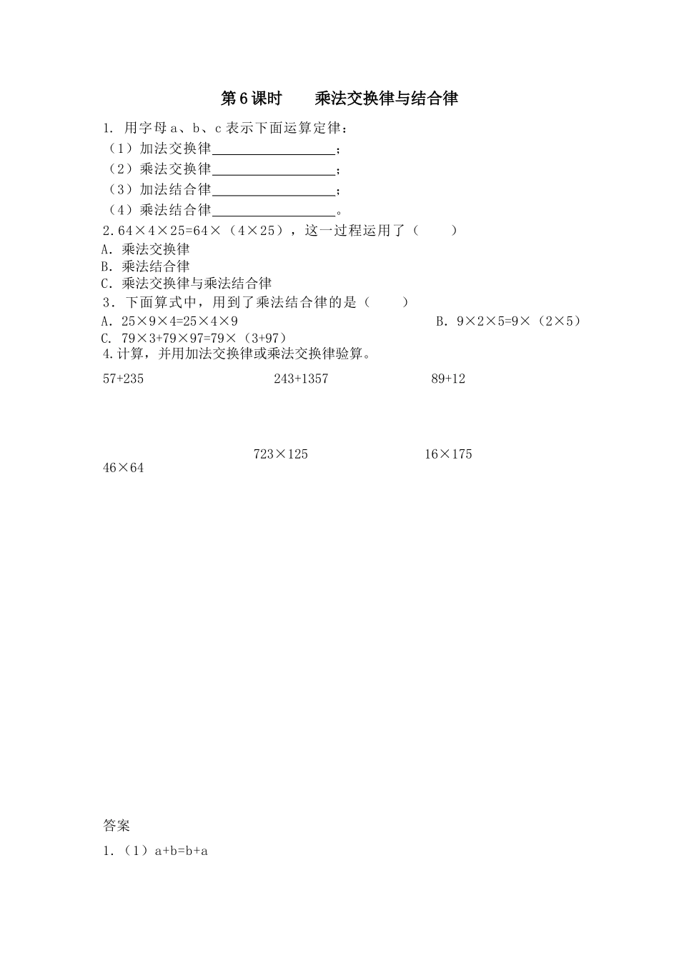 第6课时乘法交换律与结合律1.用字母a、b、c表示下面运算定律:(1)加法交换律;(2)乘法交换律;(3)加法结合律;(4)乘法结合律。2.64×4×25=64×(4×25),这一过程运用了()A.乘法交换律B.乘法结合律...