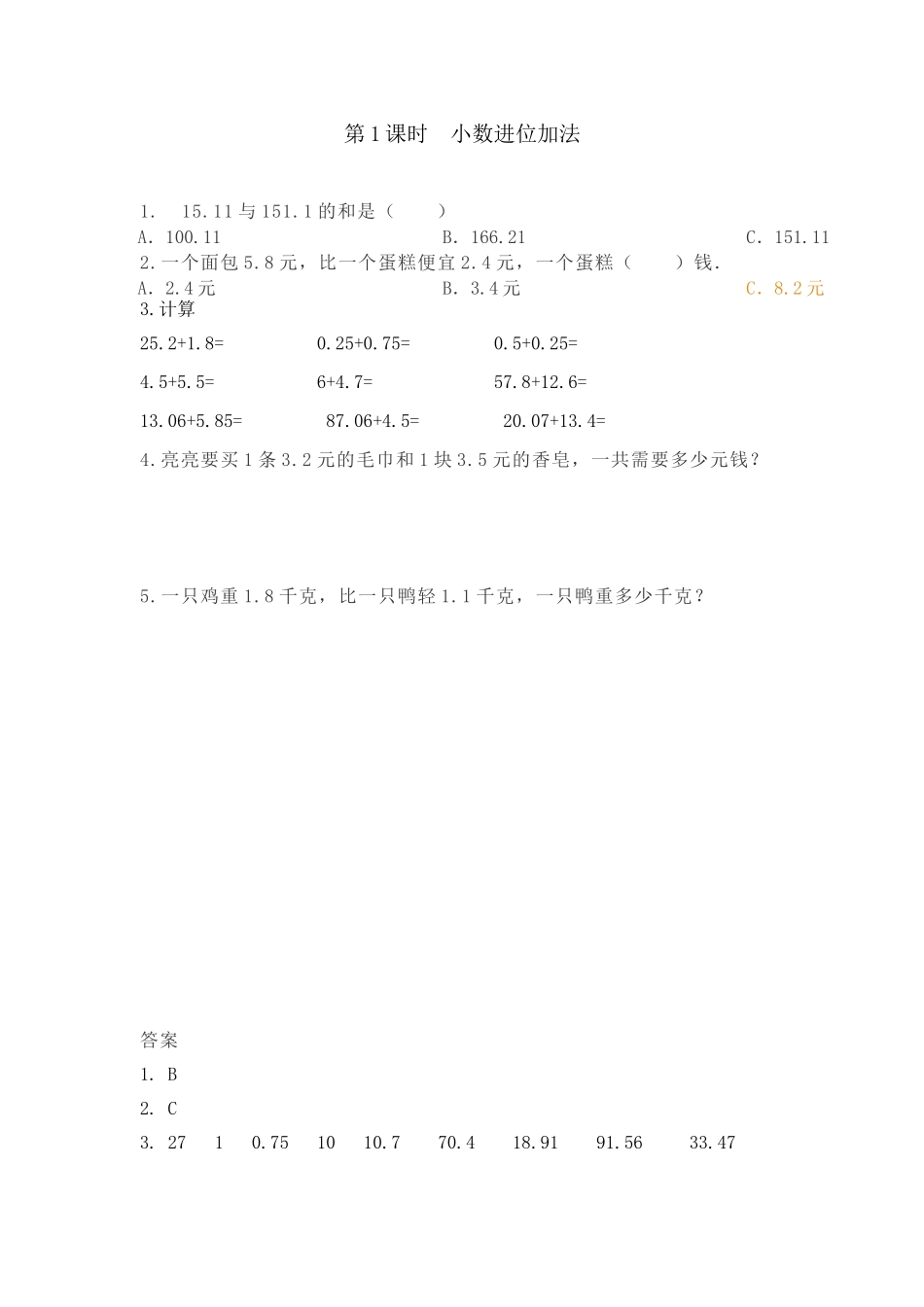 第1课时小数进位加法1.15.11与151.1的和是()A.100.11B.166.21C.151.112.一个面包5.8元,比一个蛋糕便宜2.4元,一个蛋糕()钱.A.2.4元B.3.4元C.8.2元3.计算25.2+1.8=0.25+0.75=0.5+0.25=4.5+5.5=6+4.7=5...