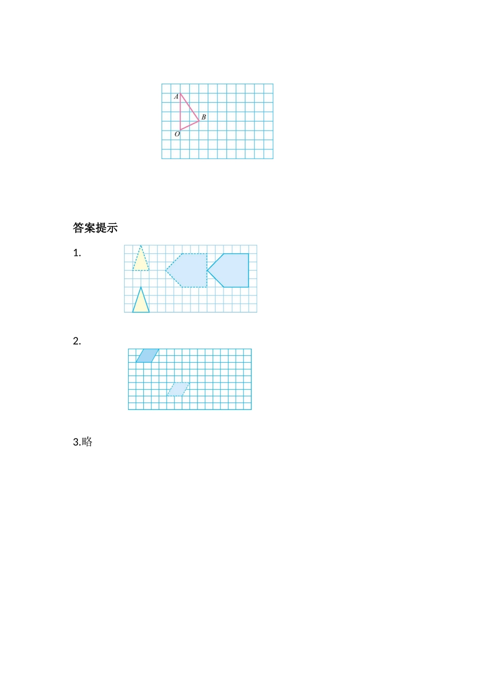 第五课时画旋转图形1.按要求移动图形。(8分)(1)把三角形向上平移5格。(2)把五边形向左平移5格。2.画出将图形先向下平移5格,再向右平移4格后得到的图形。(8分)3.画出三角形AOB绕点O顺时针旋转90°后的图形。答案提示1.2.3.略
