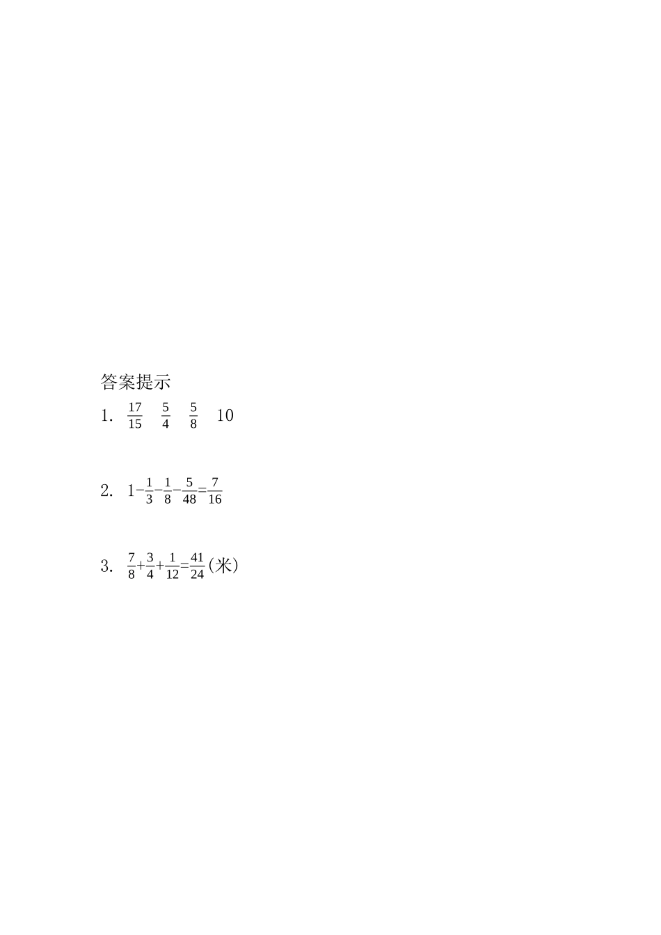第九课时连减和简便运算1.能简算的要简算。12+215+1224+1916-7161112-(16+18)11-710-3102.小明睡觉的时间占一天的13,学习的时间占一天的18,吃饭的时间占一天的548,小明每天有几分之几的时间做其他的事情?3.有一块...