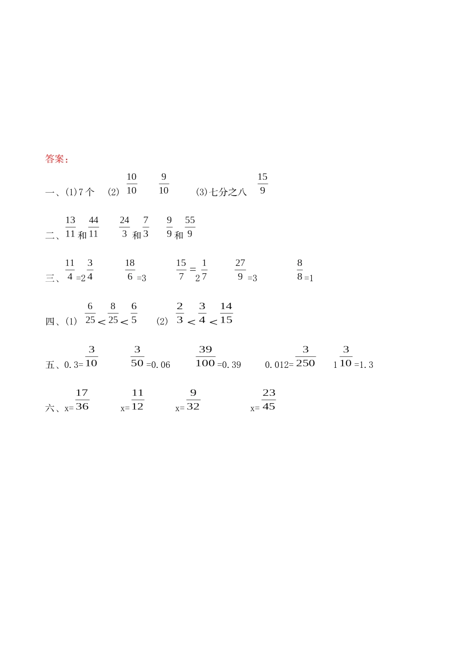 一、填空题。(1)分数单位是的真分数有()。(2)分数单位是的最小假分数是(),最大真分数是()。(3)读作(),九分之十五写作()。二、把下面三组数分别化成分母相同的假分数。和48和1和三、把下面的假分数化成整数或带分...