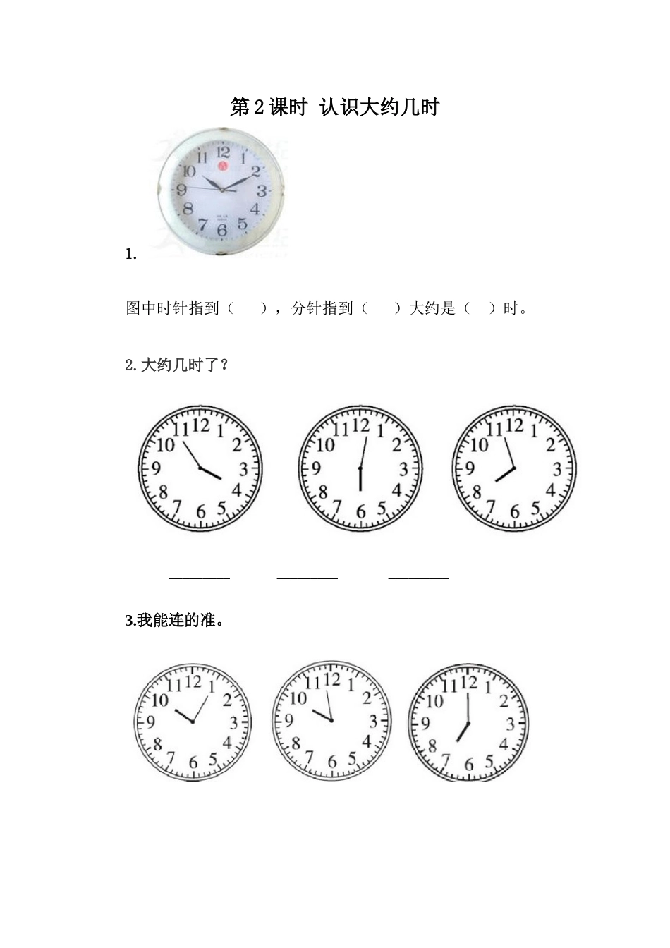 第2课时认识大约几时1.图中时针指到(),分针指到()大约是()时。2.大约几时了?___________________________3.我能连的准。7时刚过10时快10时了答案提示:1.10,2,102.4时,6时,8时3.略