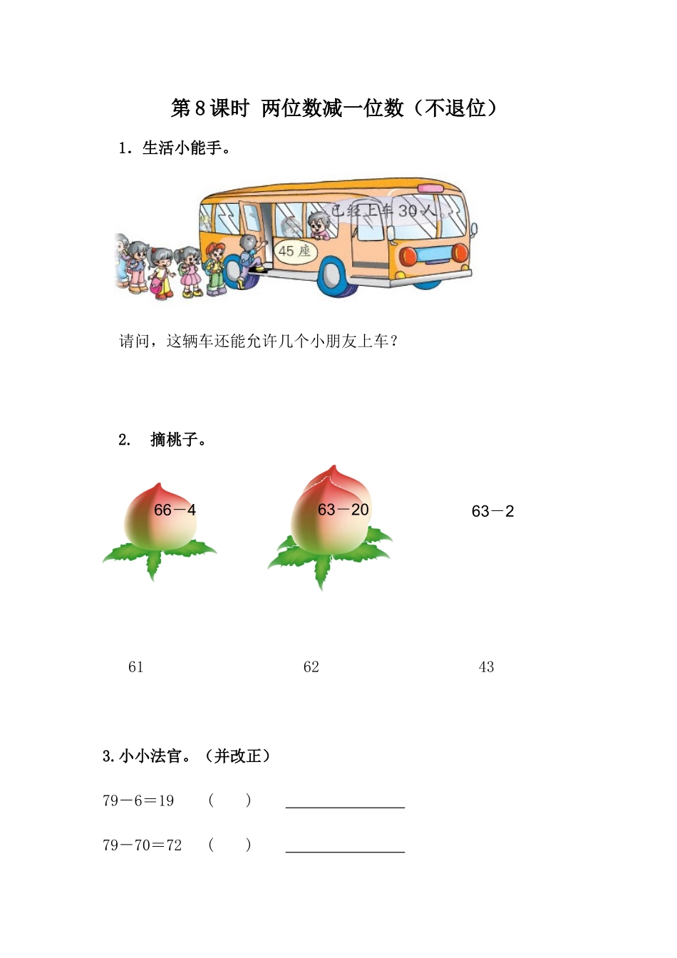 第8课时两位数减一位数(不退位)1.生活小能手。请问,这辆车还能允许几个小朋友上车?2.摘桃子。6162433.小小法官。(并改正)79-6=19()79-70=72()66-463-2063-248-3=18()48-30=45()答案提示:1.45-30=...