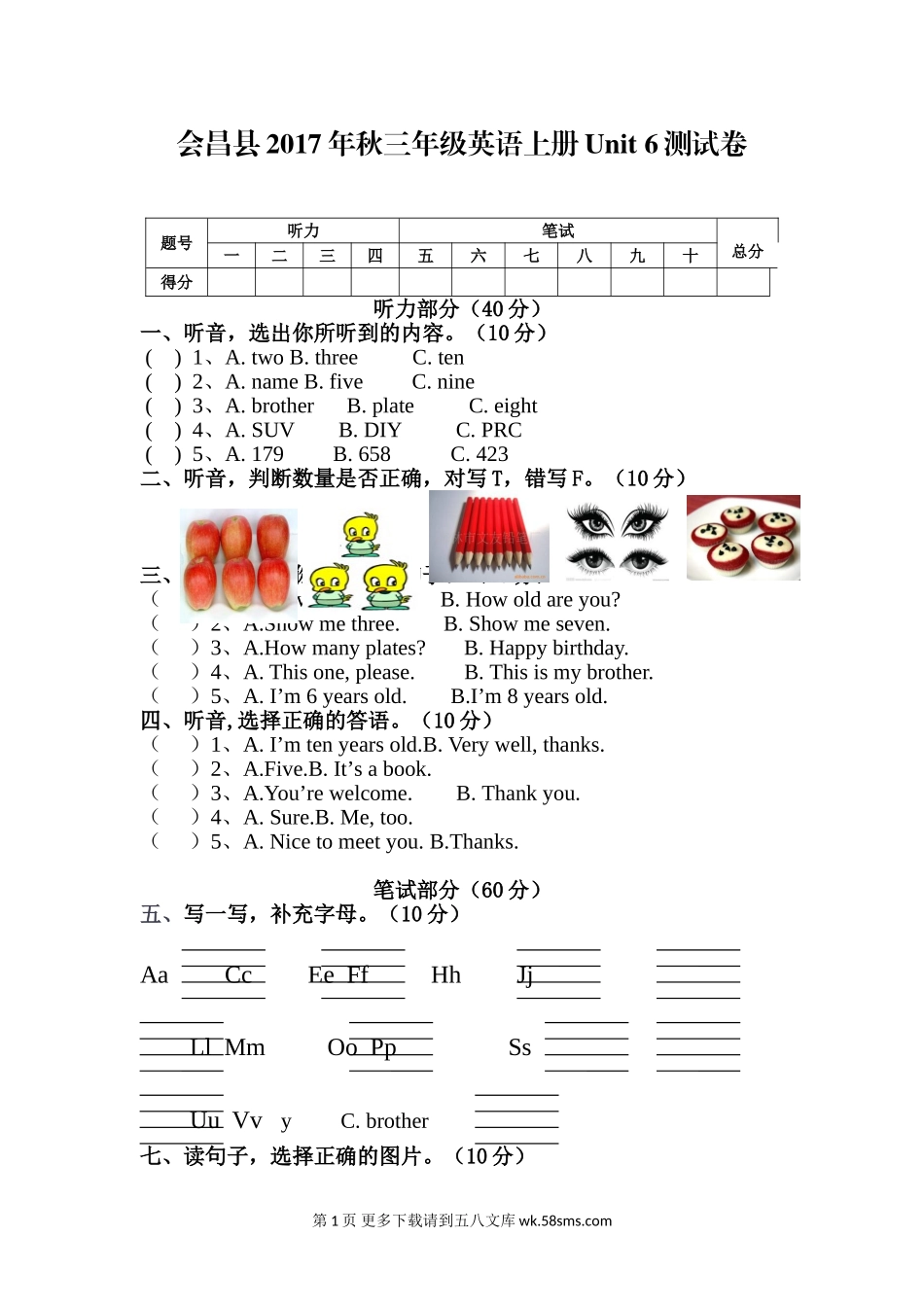 会昌县2017年秋三年级英语上册Unit6测试卷题号听力笔试总分一二三四五六七八九十得分听力部分(40分)一、听音,选出你所听到的内容。(10分)()1、A.twoB.threeC.ten()2、A.nameB.fiveC.nine()3、A.brotherB.pla...