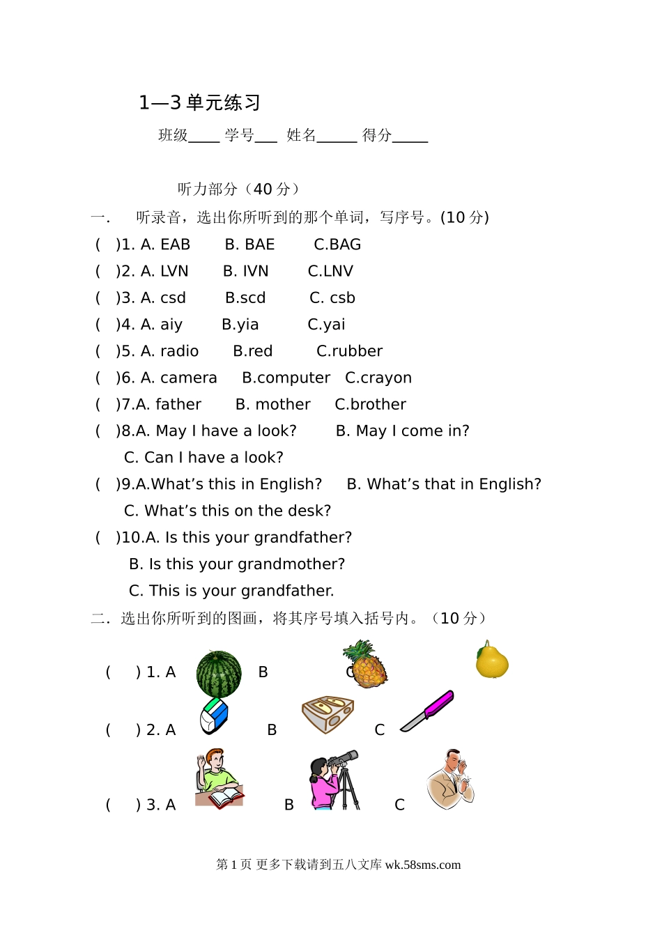 1—3单元练习班级学号姓名得分听力部分(40分)一.听录音,选出你所听到的那个单词,写序号。(10分)()1.A.EABB.BAEC.BAG()2.A.LVNB.IVNC.LNV()3.A.csdB.scdC.csb()4.A.aiyB.yiaC.yai()5.A.radioB.redC.rubber()6...