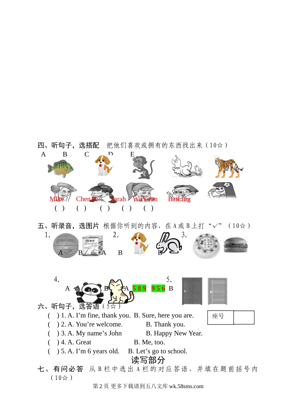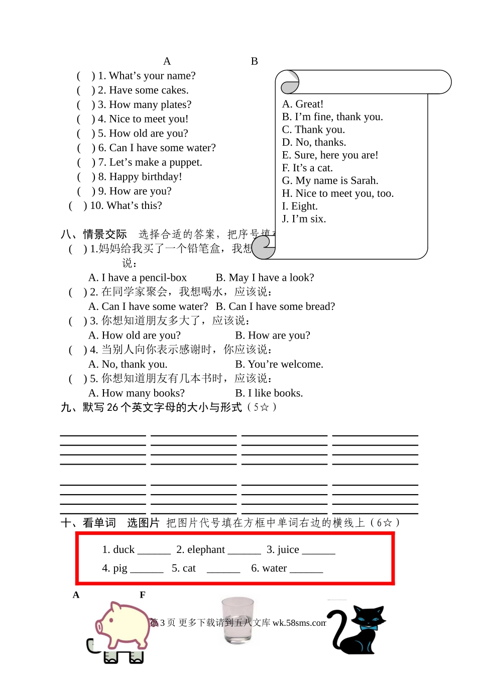 人教版三年级英语上册期末测试题时间:40分钟共:100☆(含卷面10☆)级别优秀(A)良好(B)发展(C)努力(D)听力部分【温馨提示:听之前,一定先看一遍听力部分的图和题,这样听起来就容易多了】一、听录音,...