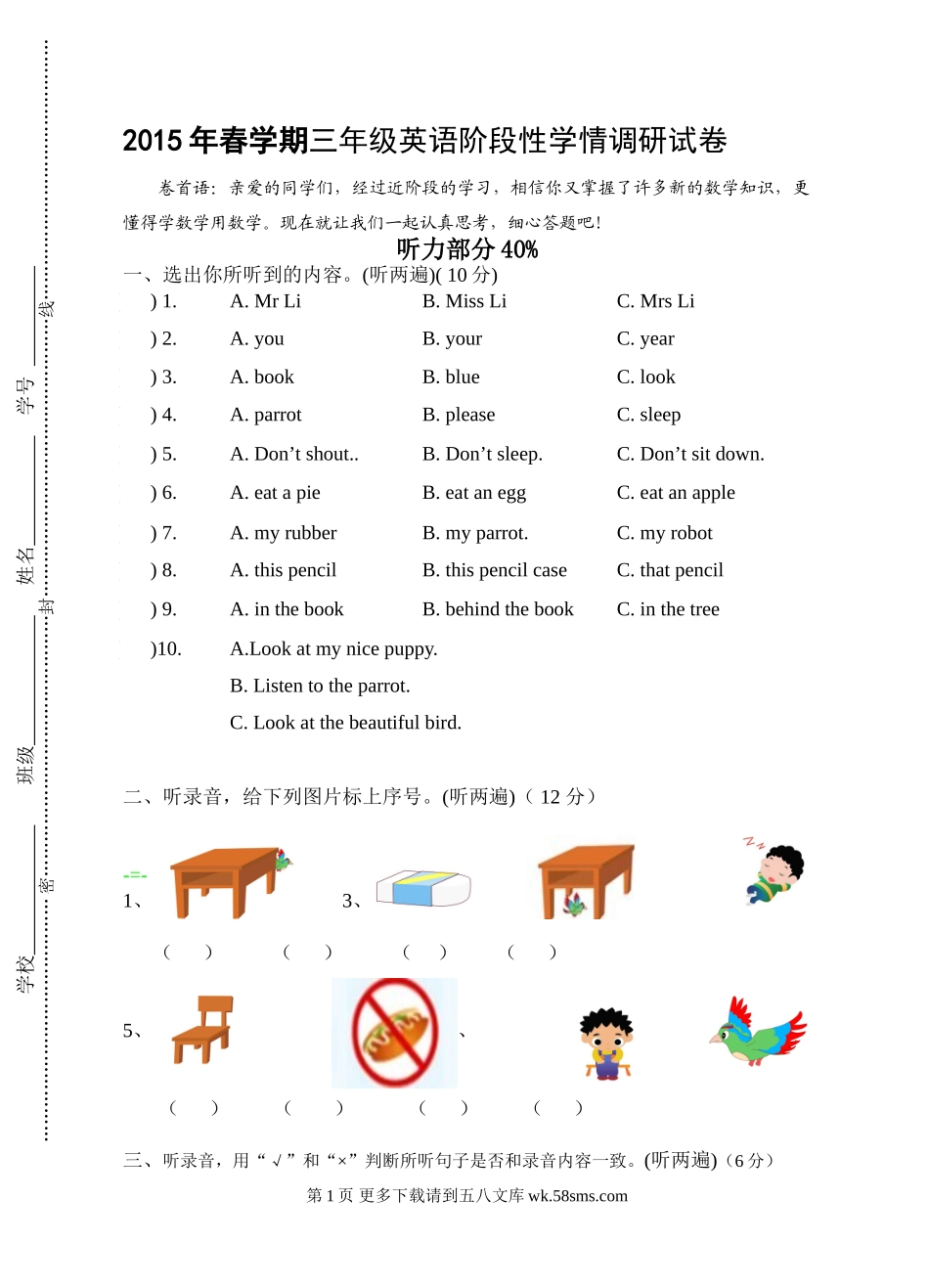 2015年春学期三年级英语阶段性学情调研试卷卷首语:亲爱的同学们,经过近阶段的学习,相信你又掌握了许多新的数学知识,更懂得学数学用数学。现在就让我们一起认真思考,细心答题吧!听力部分40%一、选出你所听到...