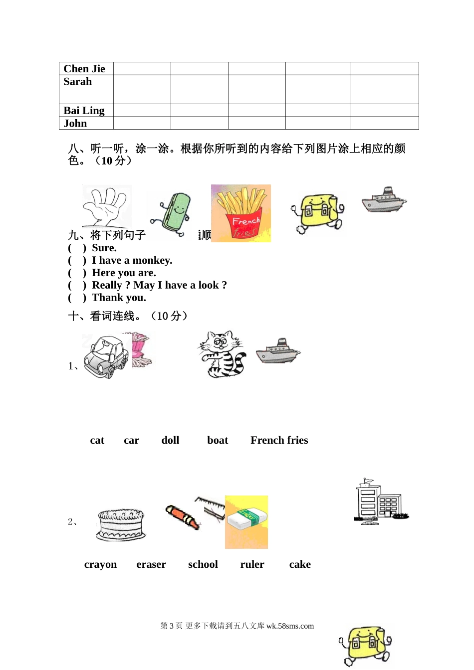 三年级第一学期期末综合卷(2)听力部分一、材料听录音,找出所听到的单词,把编号填在题前的括号里。(10分)()1、A、bearB、birdC、bread()2、A、cakeB、CokeC、car()3、A、blueB、blackC、brown()4、A...