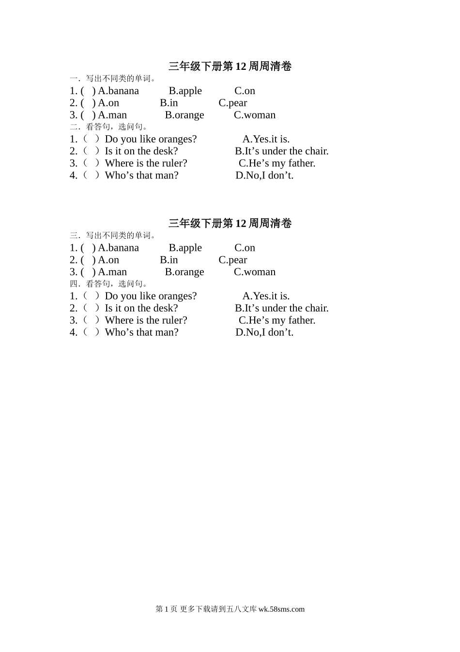 三年级下册第12周周清卷一.写出不同类的单词。1.()A.bananaB.appleC.on2.()A.onB.inC.pear3.()A.manB.orangeC.woman二.看答句,选问句。1.()Doyoulikeoranges?A.Yes.itis.2.()Isitonthedesk?B.It’sunderth...