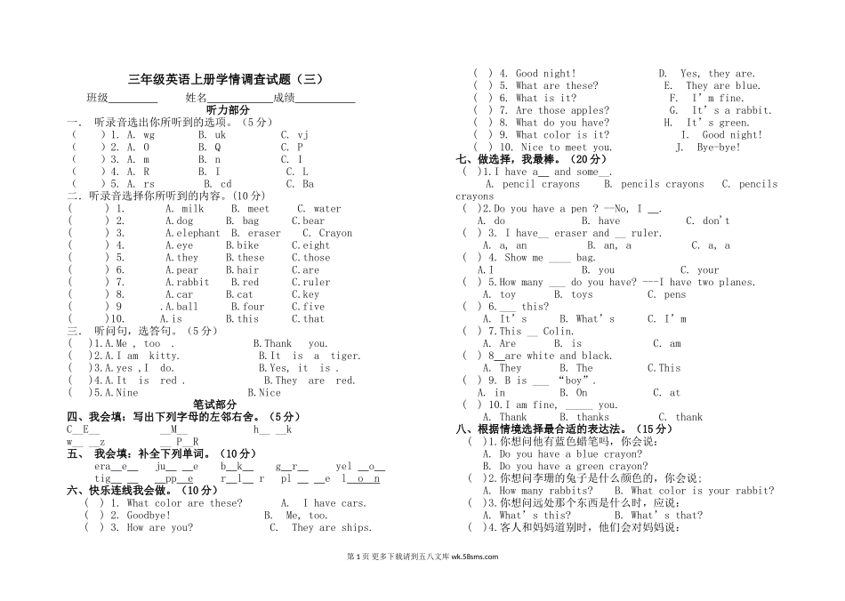 三年级英语上册学情调查试题(三)班级姓名成绩听力部分一.听录音选出你所听到的选项。(5分)()1.A.wgB.ukC.vj()2.A.OB.QC.P()3.A.mB.nC.I()4.A.RB.IC.L()5.A.rsB.cdC.Ba二.听录音选择你所听到的内...