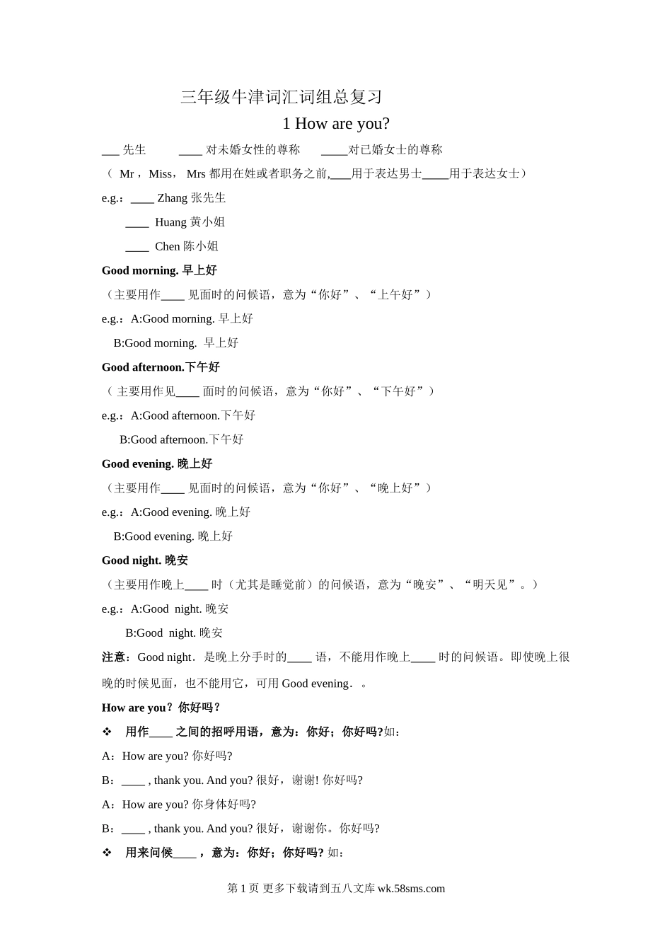 三年级牛津词汇词组总复习1Howareyou?先生对未婚女性的尊称对已婚女士的尊称(Mr,Miss,Mrs都用在姓或者职务之前,用于表达男士用于表达女士)e.g.:Zhang张先生Huang黄小姐Chen陈小姐Goodmorning.早上好(主要用...