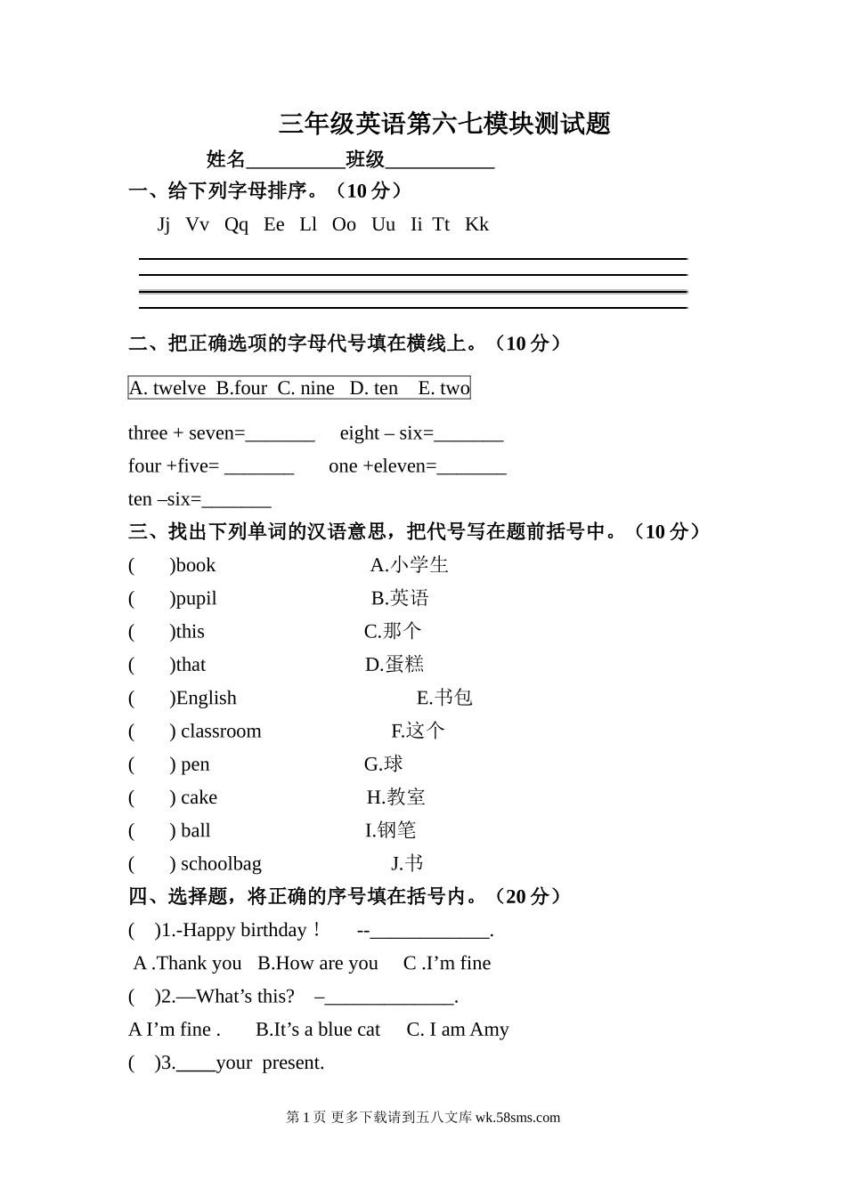 三年级英语第六七模块测试题姓名班级一、给下列字母排序。(10分)JjVvQqEeLlOoUuIiTtKk二、把正确选项的字母代号填在横线上。(10分)A.twelveB.fourC.nineD.tenE.twothree+seven=_______eight–six=_______four...