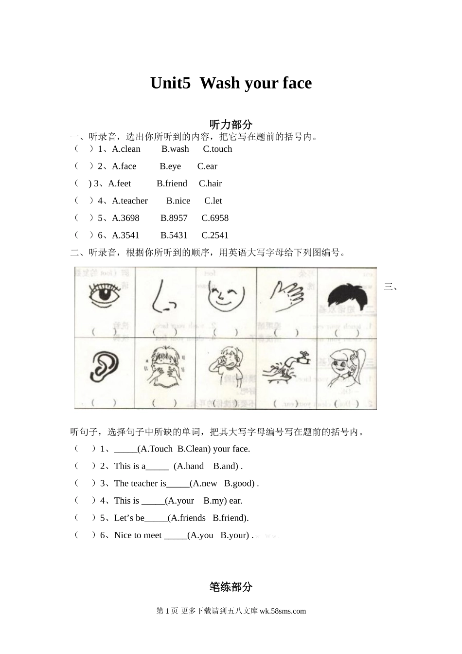 Unit5Washyourface听力部分一、听录音,选出你所听到的内容,把它写在题前的括号内。()1、A.cleanB.washC.touch()2、A.faceB.eyeC.ear()3、A.feetB.friendC.hair()4、A.teacherB.niceC.let()5、A.3698B....