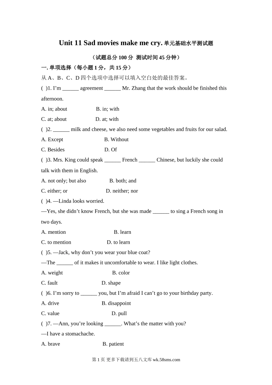 Unit11Sadmoviesmakemecry.单元基础水平测试题(试题总分100分测试时间45分钟)一.单项选择(每小题1分,共15分)从A、B、C、D四个选项中选择可以填入空白处的最佳答案。()1.I’m______agreement______Mr.Zhangth...